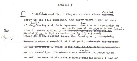 The typescript of my unfinished mystery novel, The Graves of Academe, runs 154 double-spaced pages and 16 short chapters typed on the back of pale dittoed handouts or photocopies of pages from my dissertation—if I reverse the pages, I can read discontinuous excerpts from "The Problematics of Marriage: English Comedy 1688-1710." The mystery's opening three chapters in first person are revised by hand to third; the prologue and 13 more chapters, written years later, are in third person. Eight more chapters were tentatively planned.